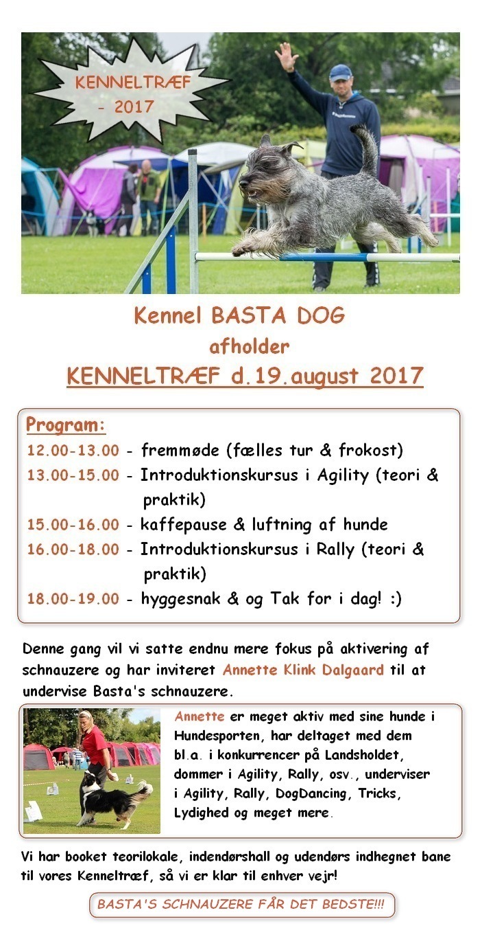 Obs. Selv om du muligvis ikke kunne tænke dig at dyrke Rally eller Agility med din schnauzer, så hold dig ikke tilbage hjemme! Kom og vær med sammen os alle og får en munter, hyggelig og lærerig dag sammen andre Basta's schnauzere og deres familier!