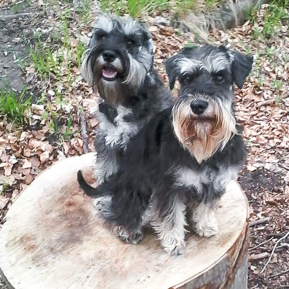 "Vi har to dejlige dværgschnauzere. En sort/sølv og en peber/salt på henholdsvis 3 1/2 og 2 år. Begge hanhunde. Da vi er flyttet i lejlighed ser vi os nødsaget til at afhænde de to. De er begge meget kærlige og omgængelige og er velopdragne.