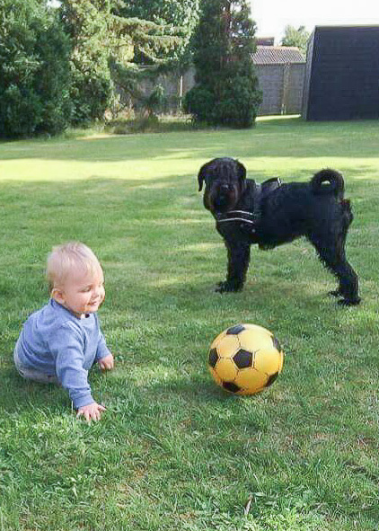 Han er på ingen måde agressiv, og børnene kan sagtens være lige rundt om ham, når han spiser - det gør han fra jorden enten ude eller gemt inde. Han er relativt stille i haven og kan bremses, hvis han gør her. Det kan man ikke andre steder. Han er meget vagtsom i bilen.