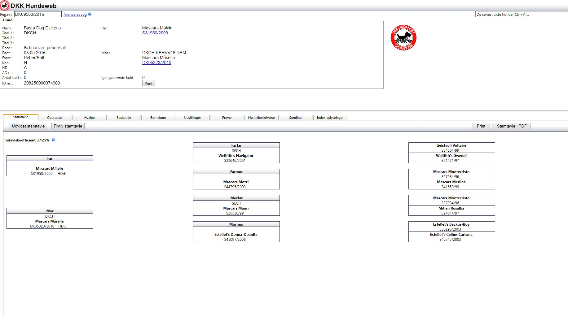 Dickens blev udstillet både i Danmark og Sverige. Han er DKCH (Dansk Champion).